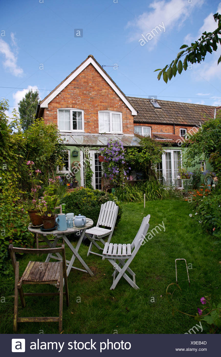 Chairs And Table Set For Tea On Lawn In Front Of Small Brick House