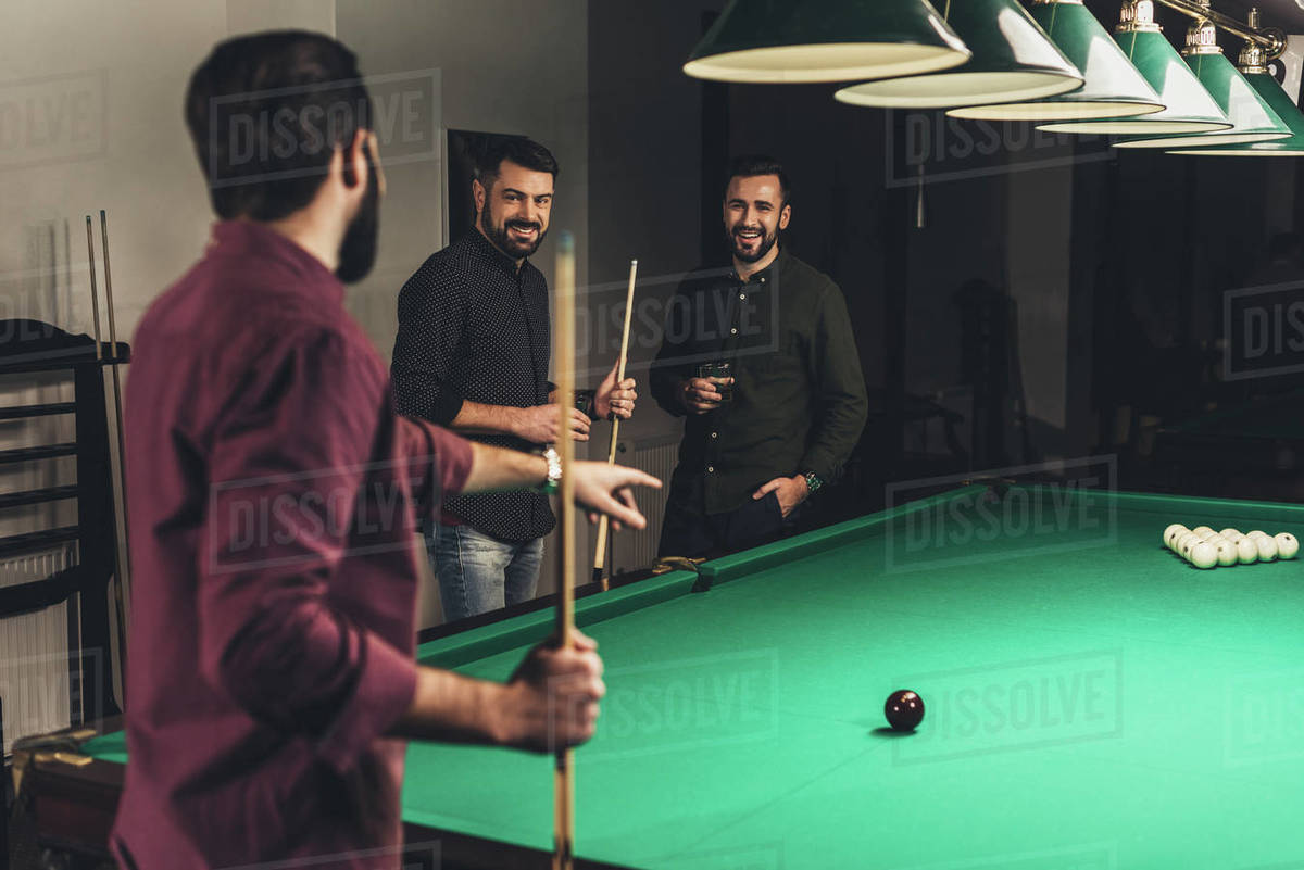 Company Of Successful Men Beside Gambling Pool Table At Bar