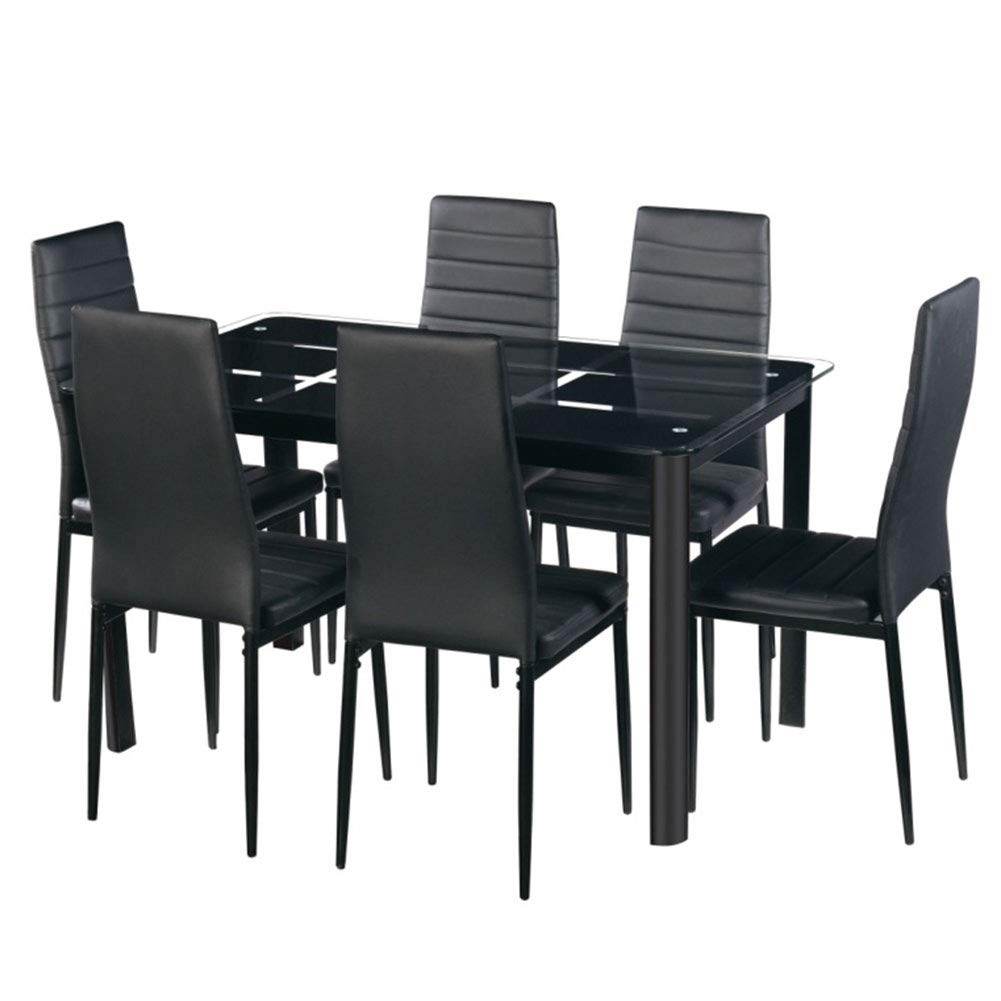 Black glass dining table and 6 chairs. The chairs are comfortably padded with curved backrests for extra support and are beautifully designed. Extend the bold aesthetic into the living room with a matching coffee table lamp table or tv unit. Black glass top dining table and 6 black vinyl chairs h76cms x w900 x l1600 chairs have small holes when you run your hands over them from my kitten at the 1249038620. All are topped with either clear or tinted black tempered glass which match beautifully the soft matte faux leather upholstery of our dining chair sets.