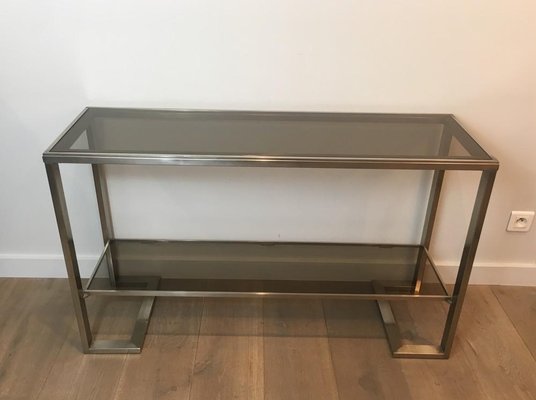 French Brushed Steel Console Table With Bronzed Glass By Guy