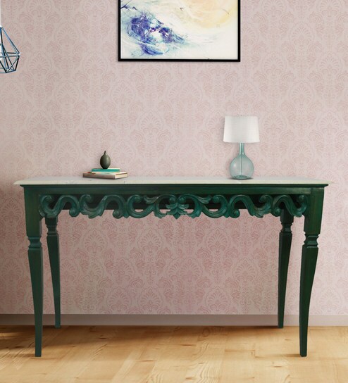 Vintage Rustic Oak Console Table With Drawers Boho Peacock Green