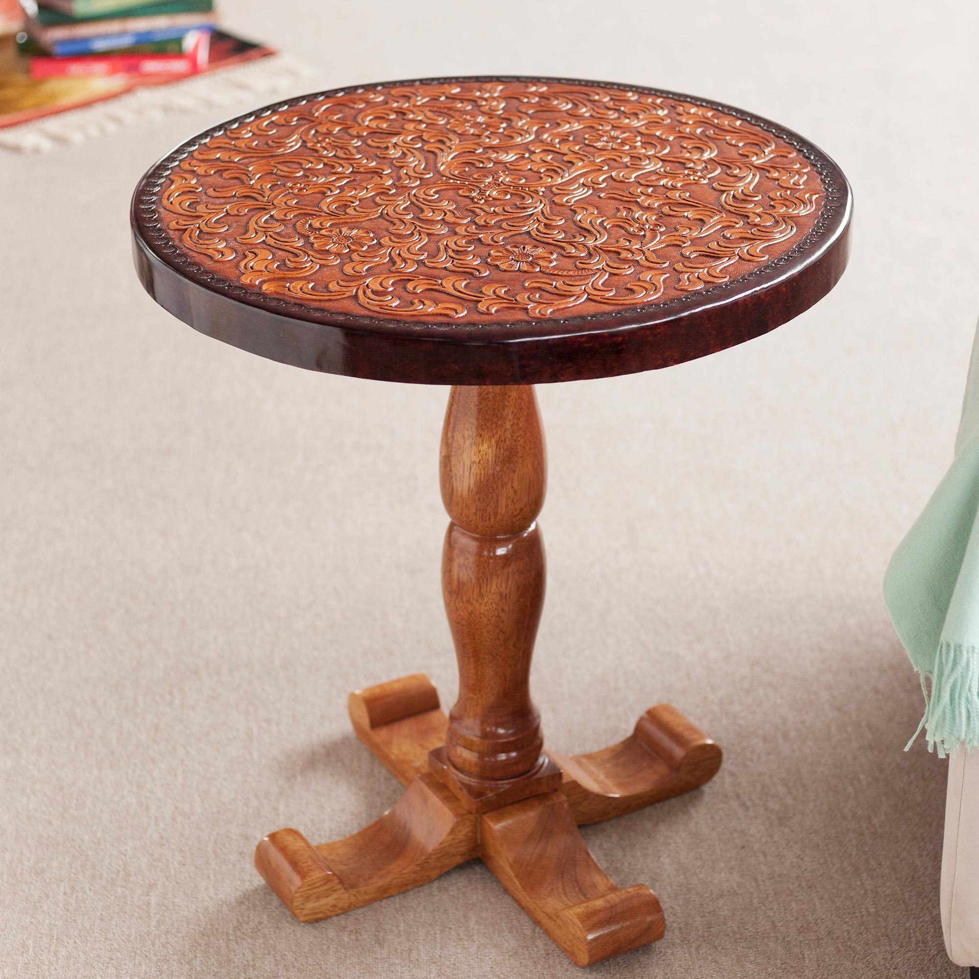 Tornillo Wood And Leather Accent Table Colonial Floral Light