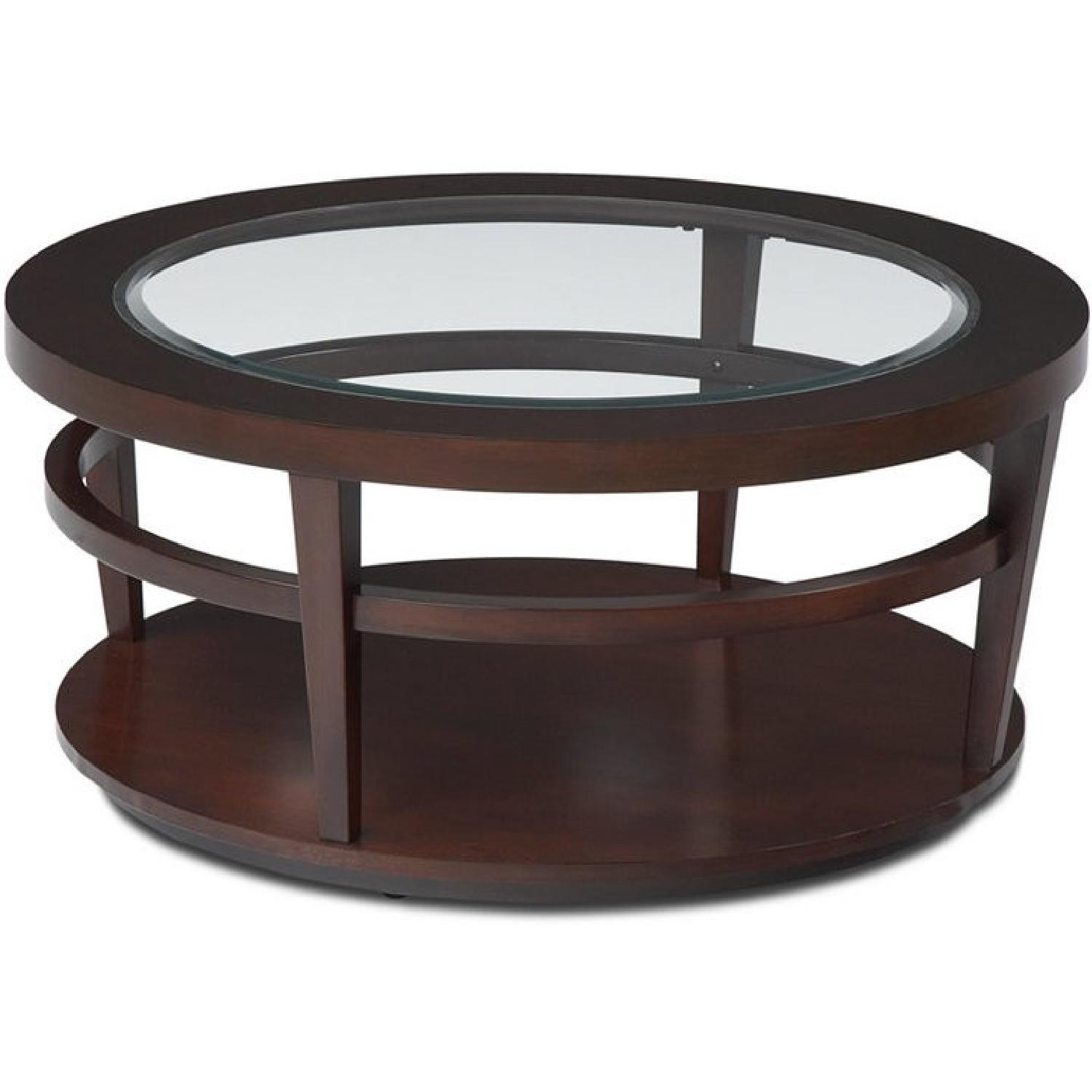 Macy S Round Wood Glass Coffee Table On Casters Aptdeco
