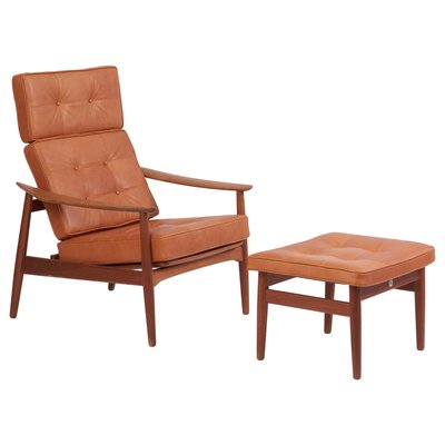 Danish Leather Teak Lounge Chair Ottoman Set By Finn Juhl For
