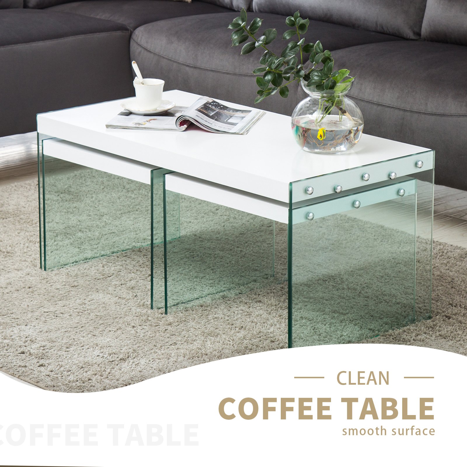 Scandinavian Small Glass Coffee Table Set With Solid Oak Legs