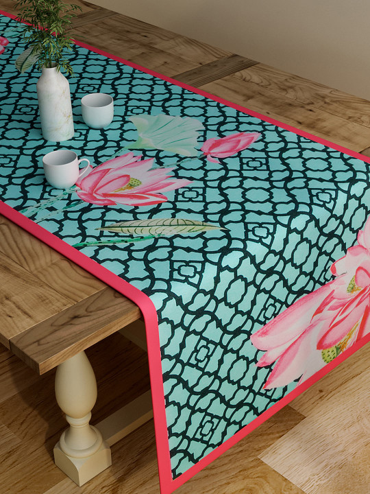 Green Pink Floral Print Rectangular 48 X 13 Cotton Table