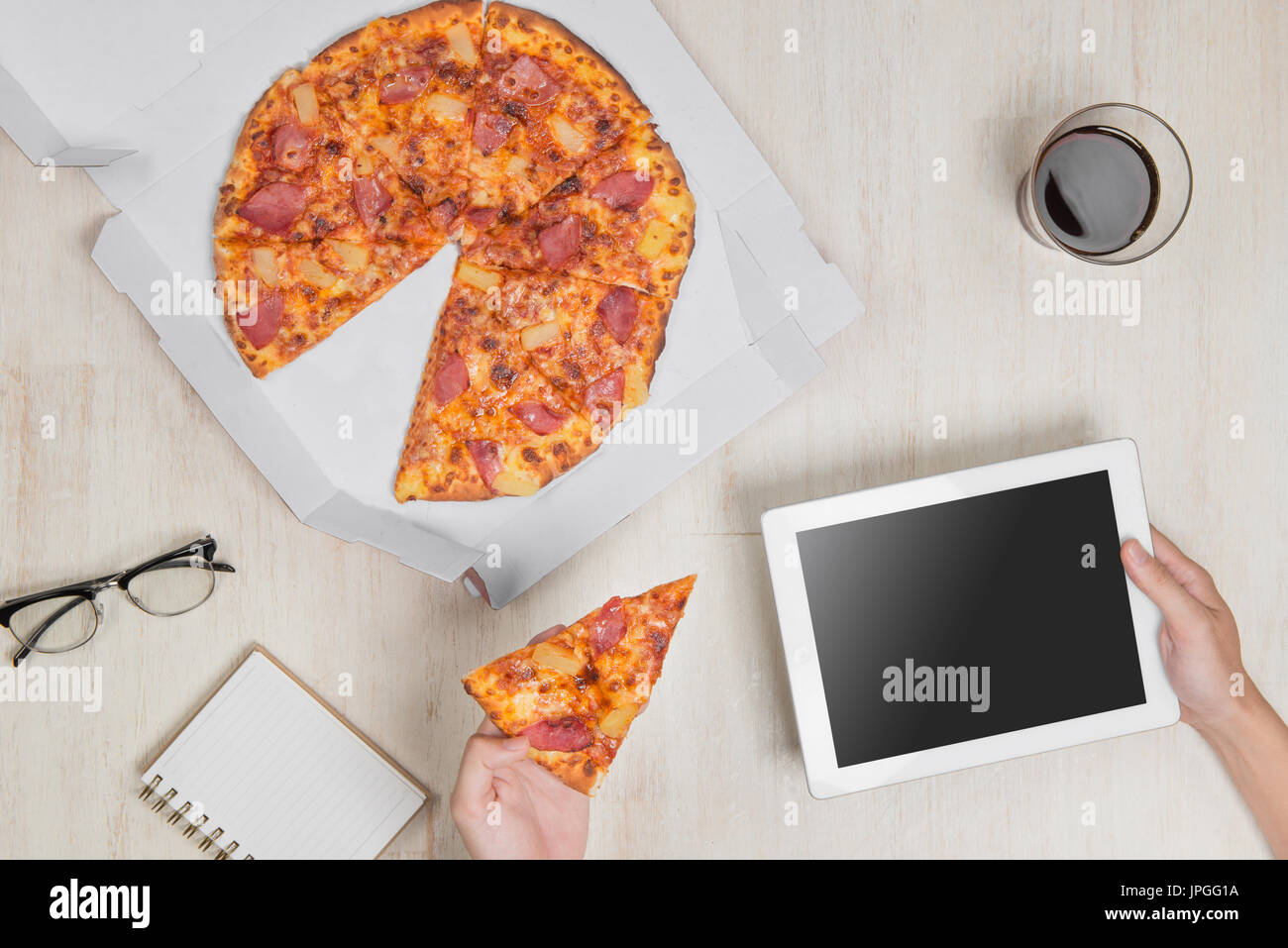 Top View Image Fast Pizza Delivery Man Eating And Using A Tablet