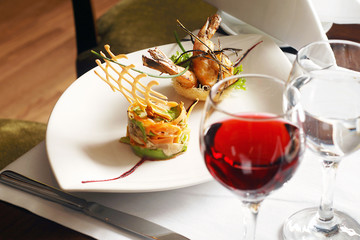 Seafood In Restaurant White Plate On The Table With Side Dish
