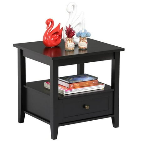 Black Wood End Table Night Stand With Drawer And Open Shelf For