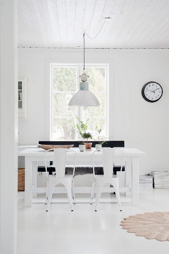 Interior Of White Dining Room With Gray Floor Black And Wooden