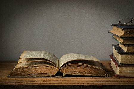 Old Book Open On A Wooden Table With Glasses Lizenzfreie Bilder