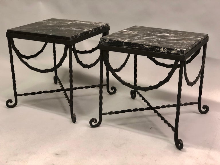Pair Of Wrought Iron And Black Marble Side End Cocktail Tables